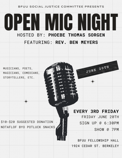 Suggested donations of $10 – $20 will benefit the BFUU & help cover expenses. No one is turned away for lack of funds! Volunteers appreciated!