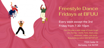 There’s no instruction. Our dancing DJs play a wide range of music to get you moving – world, funk, blues, pop, electronic, oldies, and more. Requested donation $20, no one turned away for lack of funds.