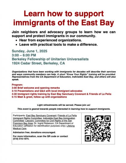 Organizations that have been working with immigrants for decades will describe their services and ways community members can help. A short “Know Your Rights” training will be provided. Representatives from the CA Department of Education, Indivisible East Bay, and others will also speak. Light refreshments will be served. Please join us! Admission free; donations encouraged.