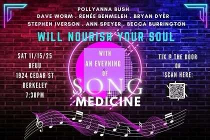 Pollyanna Bush & Bay Area luminaires, Dave Worm, Bryan, Dyer, Renée Benmeleh, Stephen Iverson, Ann Speyer & Becca Burrington, offer an evening of Pollyanna’s original songs, & magical “in the moment” circle song creations that nourish and lift the spirit, inviting the audience to melt into a deep sense of wholeness. This evening of song medicine will include opportunities for the audience to sing, as well, to bathe in the sound of voices weaving a fabric of harmony and beauty.