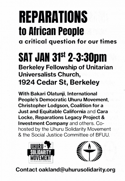 Please join the social justice committee of the Berkeley Fellowship Unitarian Universalist Church and the Uhuru Solidarity Movement to discuss the critical and relevant question of reparations to African people and learn how you can be a part of a growing movement of white people who are committed to repairing the damage of over 500 years of colonial oppression of African people.